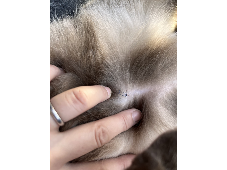 今日お腹を撫でていて分かったのですが、腹部に縫合の糸が抜糸せずに一本ついたままになっています。