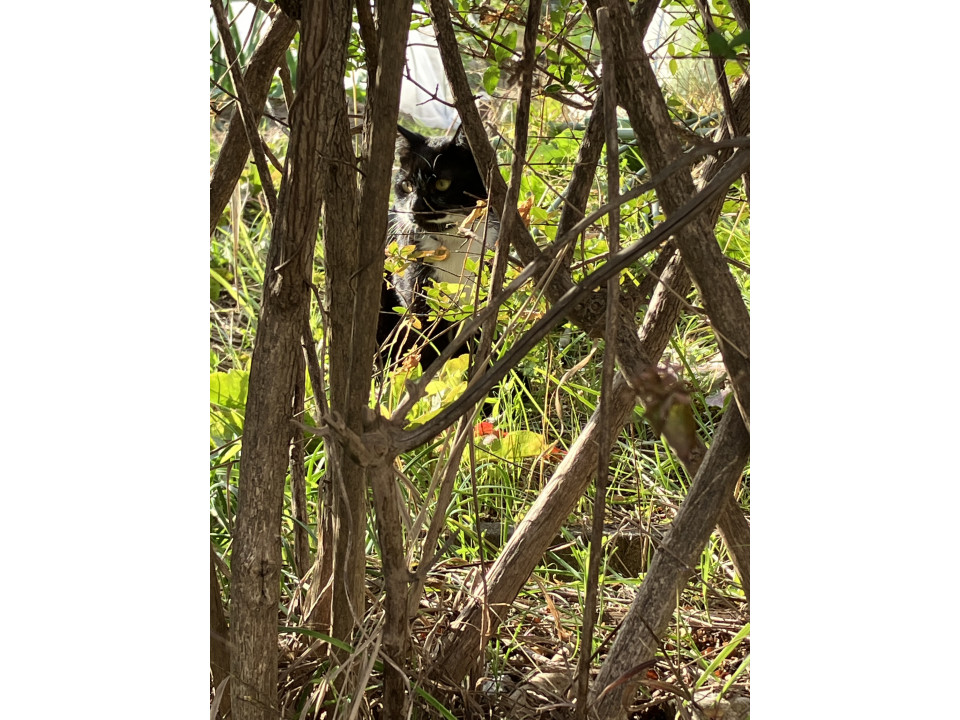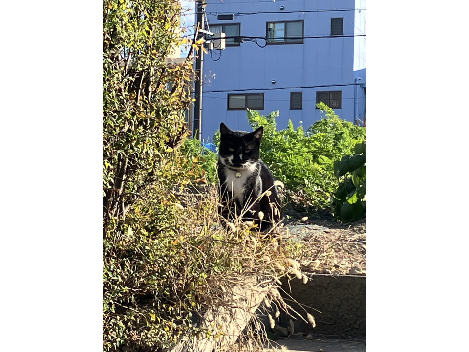 農園の駐車場で見かけました。首輪と名前プレートをつけていて、毛がツヤツヤで飼い猫のように見えます。近づくと逃げてしまいますが、ドライキャットフードを置いておいたら、あとで食べに来ていました。