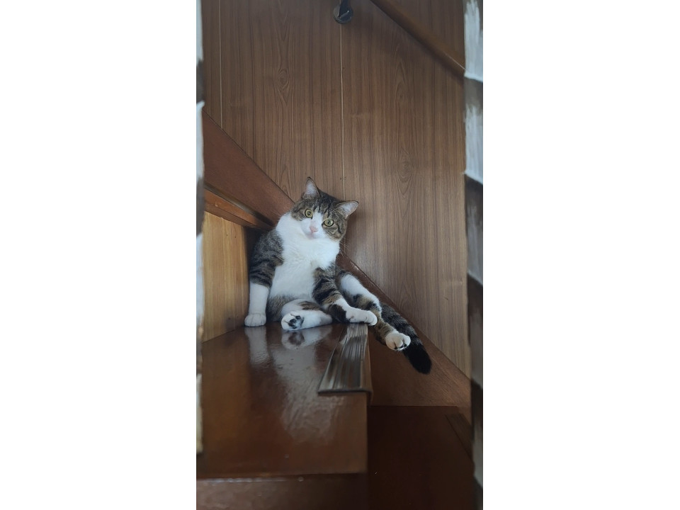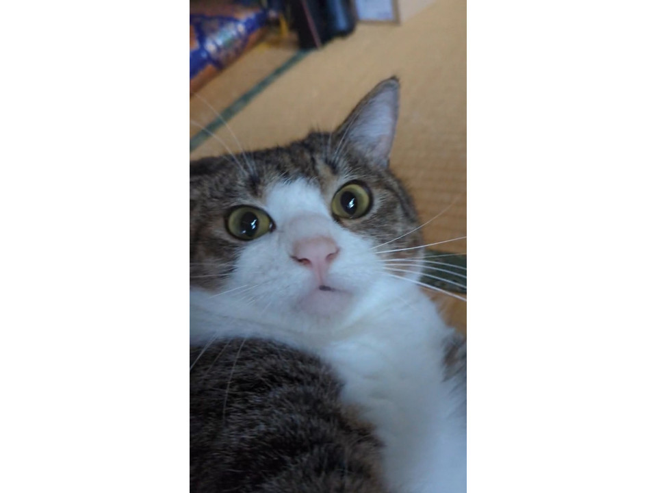 とてもビビリな子です。とても立派な長い尻尾で、下くちびるに黒いアザがあります。大人ネコですが、子猫のような鳴き声です。