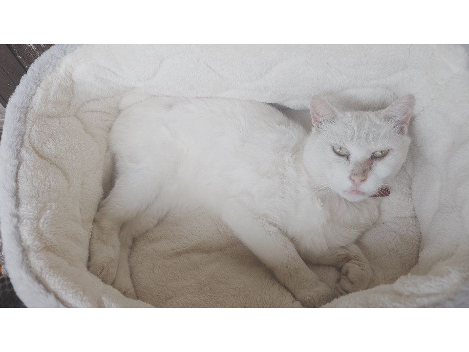 全身真っ白の丸顔です。左目に目ヤニが出てることが多いです。