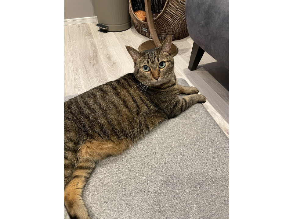 茶色のキジ猫です。目が大きくて体も大きめです。脱走当時は赤い首輪をしています。