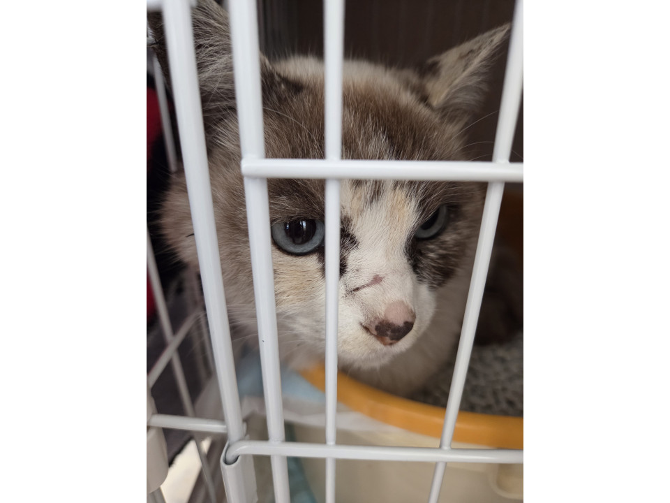 数日前より姿を見るようになり目が合うだけで駆け寄りスリスリしてくる。そばを離れない状態。車に荷物を積もうとドアを開けると隙を見て車に乗ってくることから飼い猫の可能性が高く数日様子を見ていたのですが誰にでも寄っていき警戒心薄いため危険なので保護しました。鼻のところ少し怪我してますが大きな怪我は見られません。かなり空腹の状態が見られました。
