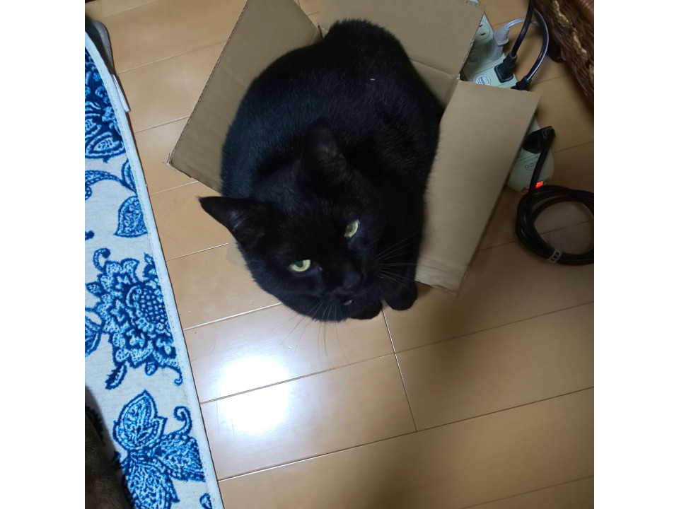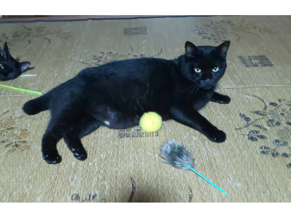 体が大きな黒猫君です。シリコン製のピンクのノミよけの首輪をしています。切れて外れているかもしれません。