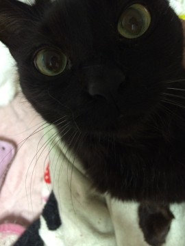 黒猫ですが、太陽の光に浴びると茶色く見えます。長毛です。顔は小顔で美人さんです。背中に一本白い毛があります。お腹の毛がグレー?白?い。りーたんと呼ぶといつもは大体返事をしてくれました。割と大きく長くも見えます。