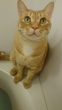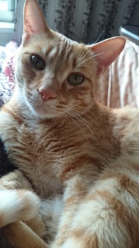 茶トラの男の子です。胸元とお腹は白くなっています。