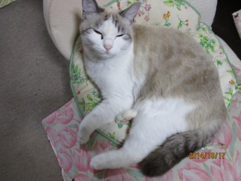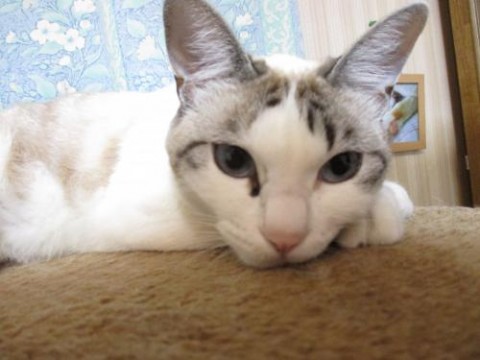 毛色:耳、背中から尻尾がグレー。顔は八割れのような感じ。手足とお腹は白い。