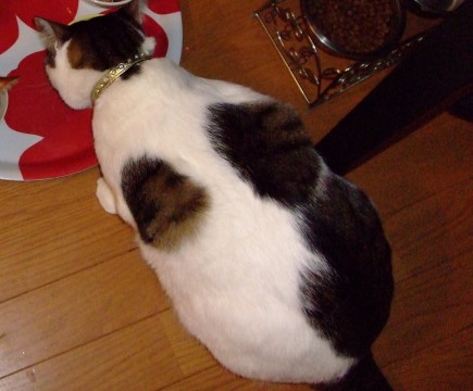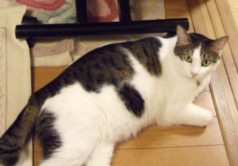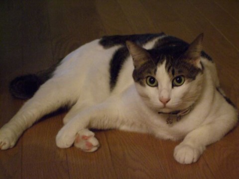 背中にサバ柄の入ったおなかなどに白い部分が多い、大きな猫です。