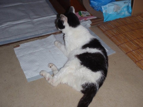 白黒八割れ 首輪なし 後ろ脚麻痺 前足で移動