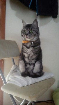 ぽっちゃり、声がかすれ気味、黄色い首輪