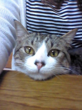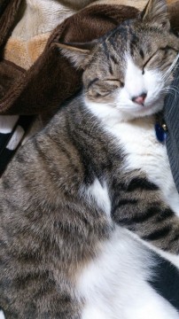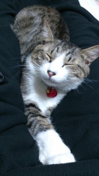キジトラ白混ざりの♂去勢済みです。しっぽが短く左曲がりのかぎしっぽです。水色の首輪に猫顔型の赤いネームプレートをつけています。