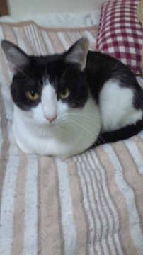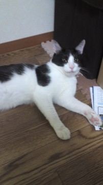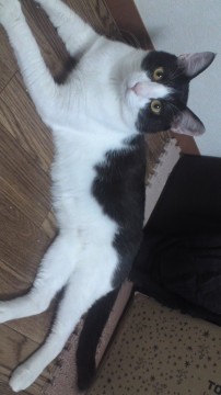 白黒はちわれです。しっぽは長いです。ハート型っぽい模様があります。