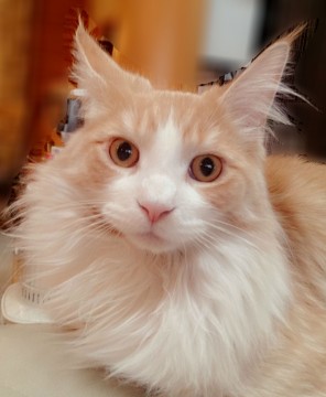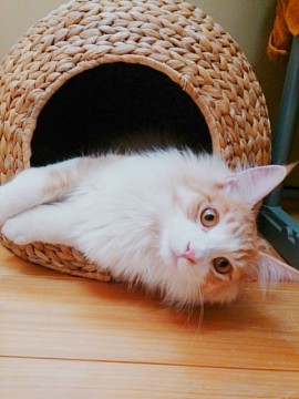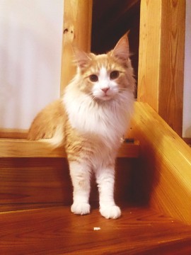 薄い赤トラ風でぱっと見はクリーム色っぽく見えます。長毛種の大型の猫なので普通の猫に比べるとかなり目立ちます。