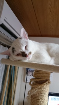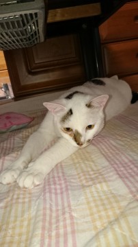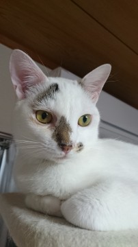 日本猫。全体は白地に背中にキジトラの雪だるまの様な模様があります。尻尾は尾長で黒っぽいです。去勢済。右目がいつも涙目です。頻繁に拭かないと目やにがたまります。鳴き声は甲高いです。赤い首輪をしています。人懐こい子です。