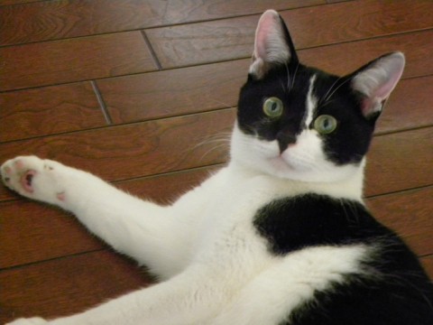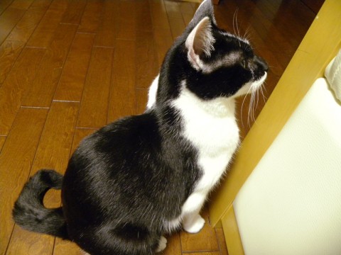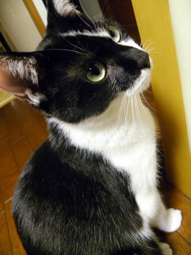 白黒(ハチワレ)、しっぽはカギ尻尾になっており、