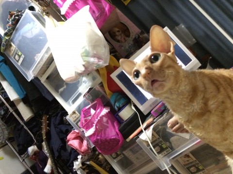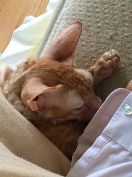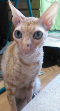 種類'コーニッシュレックス。宇宙人顔。薄茶と白のトラ系。耳が大きく目が大きく、短毛で毛がカールしていて細身。三角の顔。鼻にホクロ。