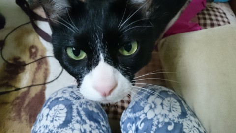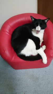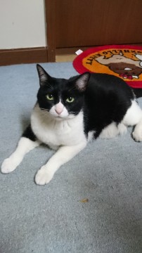 白黒ですが黒が多め。はちわれでずっしりした体型。体型に似合わないか細い声。