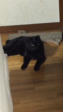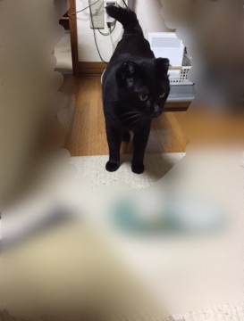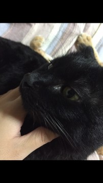 黒 両耳の先がなくて丸くなっている しっぽは7cmくらい 目は緑色っぽい さわられるのはあまり好まない