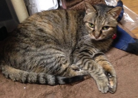 しっぽは長く、写真は首輪していますが、現在は首輪していません。首の周りははげています。目は黄色く、茶色混じりです。毛色はキジトラ(茶色と黒色)です。よたよた歩きの老猫です。