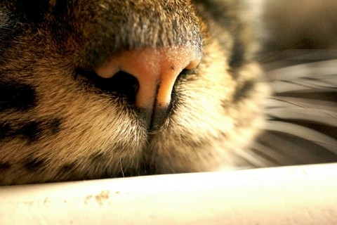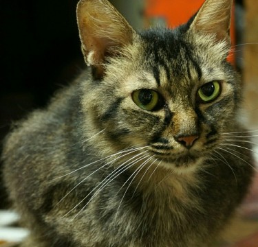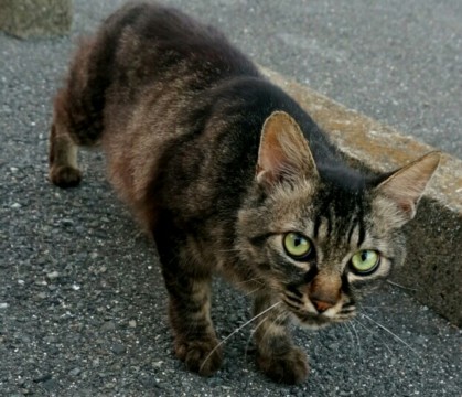 黒に近い虎猫、尻尾は長く触ると先だけカギ尻尾、鼻に黒い点が1個(写真参照)、尻尾の毛が長い