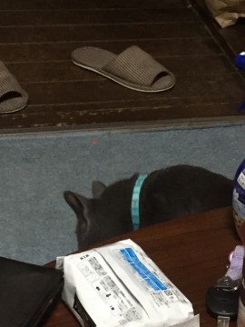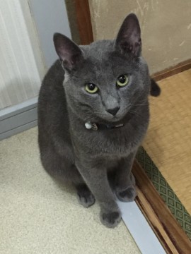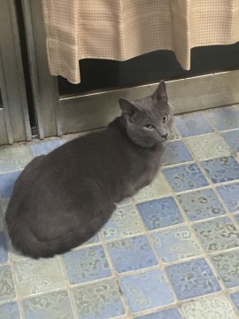 名前はマルです体重5キロ雄、種類はロシアンブルー首輪有り水色ぽい魚柄