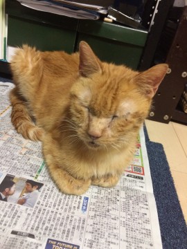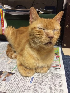 茶色のアメショ柄。病気と歳で痩せて毛艶がない。ガリガリに近いほど、痩せています。首輪をしていないが首輪跡で首周りの毛が薄い。オスで去勢済み。背中に、2cm程の小さいコブみたいなものがあります。鼻が詰まっており、ブーブーやブヒブヒといった鼻息が出る。病気で下の歯がほぼなく、ドライフードが食べられないため、モンプチの缶詰が好物。目が窪みがちで、あまり見開けない。臆病ではありませんが、人懐こいほど寄ってくる感じでもありません。