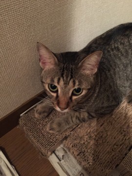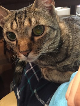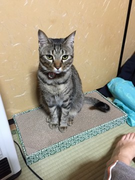 キジトラ、去勢済み、赤い首輪をしています。首輪にはハートの名札がついていますが文字は擦れて消えてしまっています。
