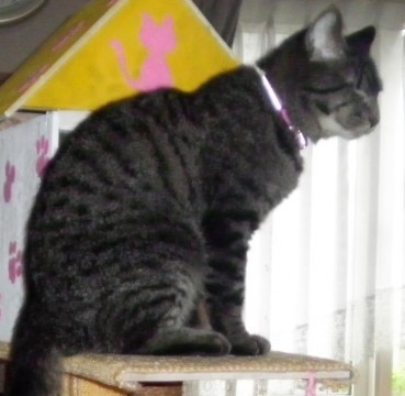 ピンク色の首輪をつけています。