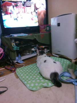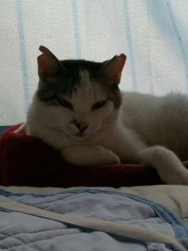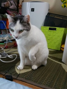 白色、短い黒尻尾、頭黒色、体に黒い丸が3つ、両耳が少し切れてる、