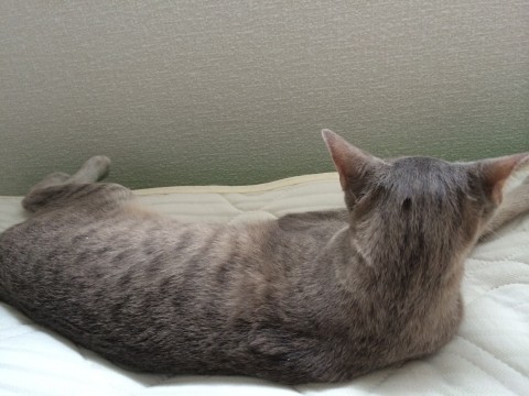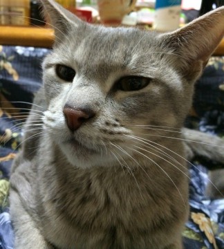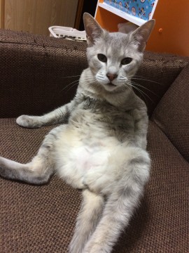 アメリカンショートヘアとロシアンブルーのミックスで全体的にグレー、背中のヒョウ柄のような点々になってます。