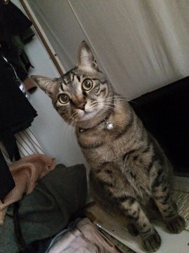 ○首輪は襟型の布製で、紺色に白色の水玉模様。銀の鈴が一つ。(今は外れているかもしれません)
