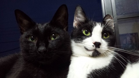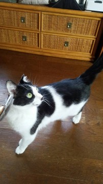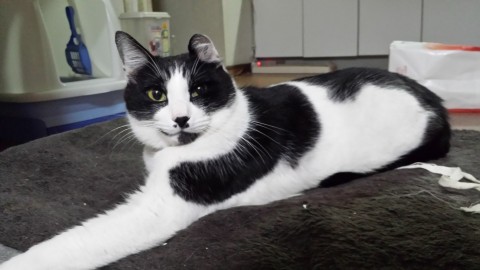 白黒のハチワレです。左の耳が、怪我により固くなり変形しています。しっぽは長く真っ直ぐで、肉球はほぼ全てピンク色です。