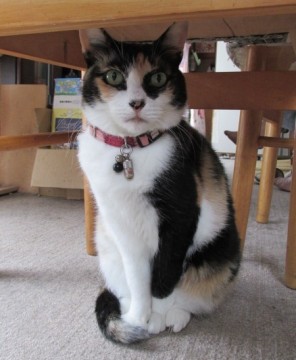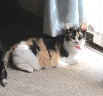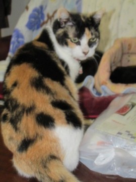 茶色ベースの三毛、胸元、右手は白のメス、推定13歳、小柄な猫です。