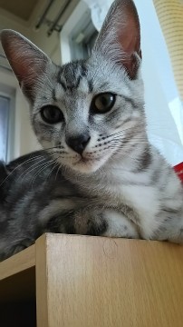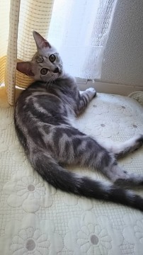 【特徴】:アメショーそっくりのグレー&タビー柄、大きめの耳、警戒心が強い