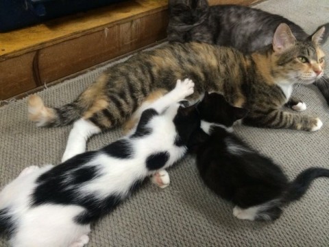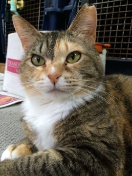 成猫です。キジトラ三毛です。避妊手術済みで左耳先にカットがあります。尻尾の先が明るい茶色です。首(よだれかけ部分)、両脚が白色です。体格は少しぽっちゃりしています。首輪はありません。