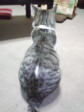 背中のトラ模様の中に一点だけ白い毛が入っています