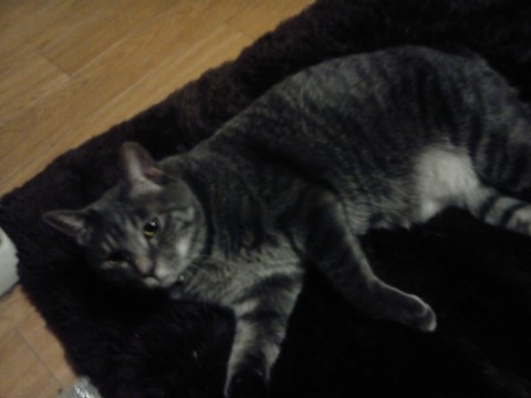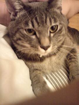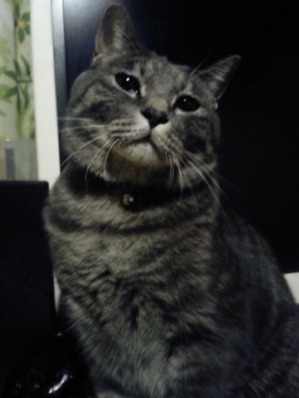 アッシュグレーのトラ猫で、黒色でダヤンキャラクターの柄の鈴付きの首輪をしています。