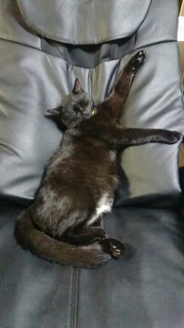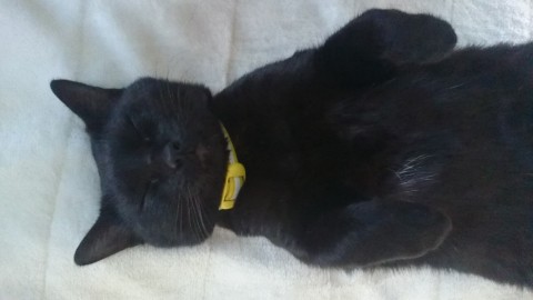 黄色い首輪をした黒猫の女の子。お腹に白い模様。