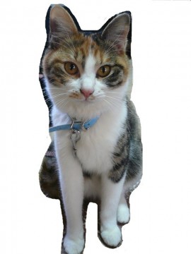 三毛猫で、とれていなければ柄物の赤い首輪をしています。(鈴付き)