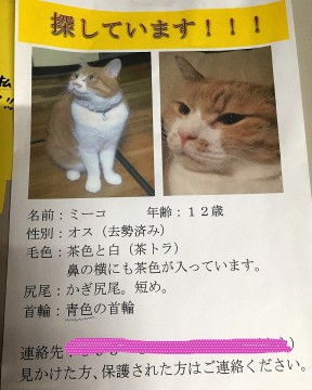 猫仲間の連絡網を使い町内のショップ(猫仲間)などは、お店の方々から『協力しますよ!』と連絡頂きチラシOKを承諾頂き貼り終えています。