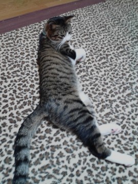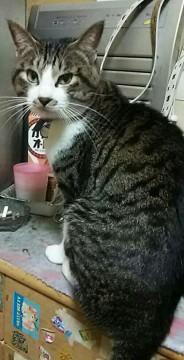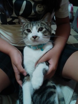 サバ白で尻尾は長く左足の肉球の所に黒い斑点、首輪は水色。