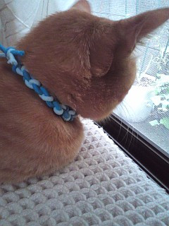 水色と青のゴムひもで作った首輪をしています。(鈴付き)