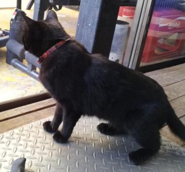 ・特徴:顔は細面で、赤のチェックの首輪、首輪の下右胸あたりに20本位白い毛があります。