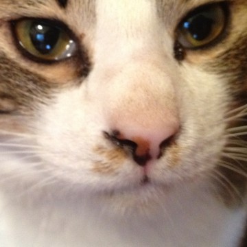キジトラ、八割れ模様、鼻水に見える模様あり。