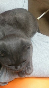 スコティッシュとロシアンブルーのミックスで、耳がたれてて座るときはスコティッシュの座り方をします。