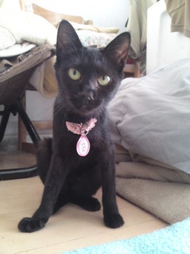 黒いゴム製の、ピンクの花飾りが2つと金の小鈴1つ、ピンクの迷子札の付いた首輪をしていました。