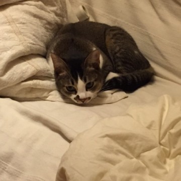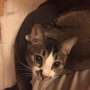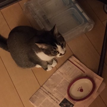 濃いグレーあごの下はふわふわの白、靴下足。首輪はしていません。