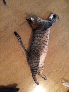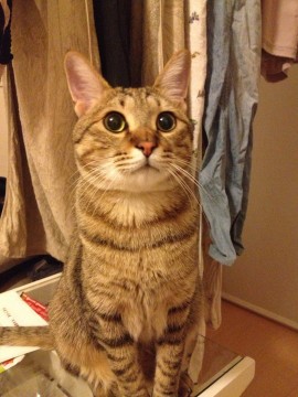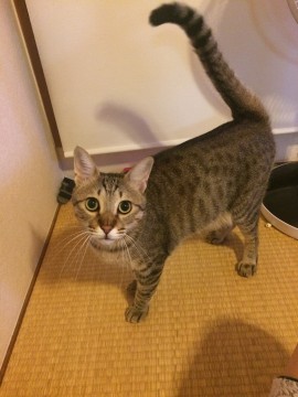 キジトラで目が丸く、尻尾と胴が長くて大きめの猫です。とても臆病な性格です。