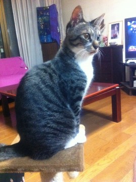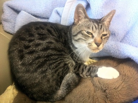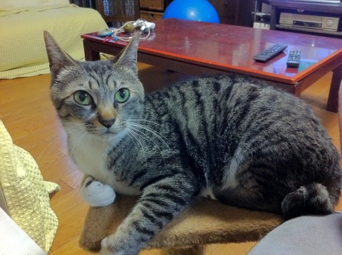 鯖トラ 尻尾がギザギザの鍵尻尾 現在は右前足の付け根辺りが怪我で禿げています。