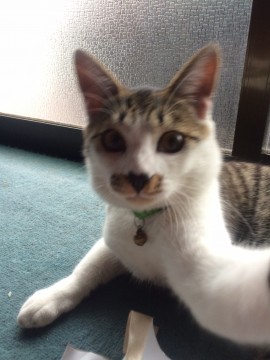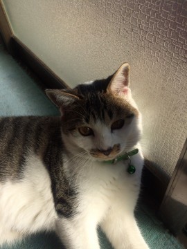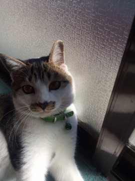 鼻の下に茶色い模様があります。ちょっとぽっちゃりです。黄緑色の首輪をつけています。名前を呼ぶと小さいですが返事をします。