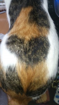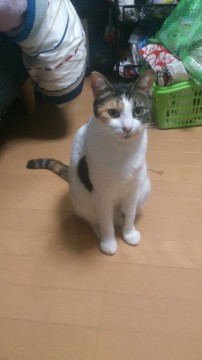 前から見ると白い部分が多く、後ろ姿は三毛柄が多いです。背中に黒トラ柄でハート模様が見えます。左目に上下のアイラインが入っています。目つきは悪いです。性格はツンデレで人見知りですがなれると甘えん坊です。首輪はしていません。